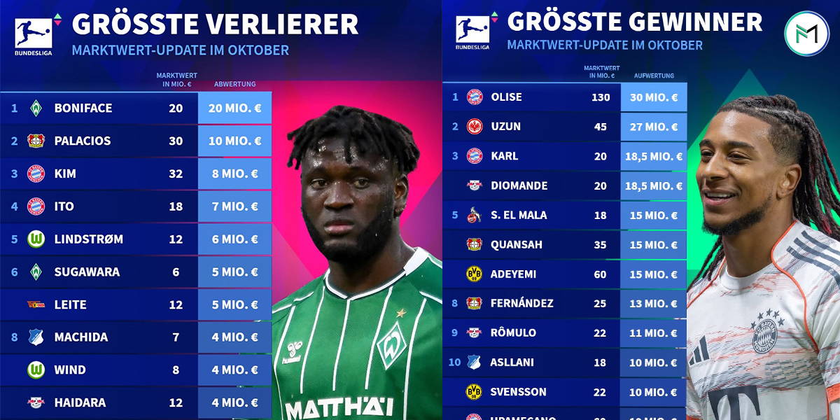 جان اوزون، مهرهی تهاجمی ترکیهای آینتراخت فرانکفورت هم پس از عملکرد درخشانی که در شروع فصل جدید داشته، با افزایش ارزش قابل توجه ۲۷ میلیون یورویی، ارزشی ۴۵ میلیون یورویی پیدا کرده است. ویکتور بونیفیس که تابستان امسال راهی ورودربرمن شد نیز پس از شروعی ناامیدکننده، ۲۰ میلیون یورو افت قیمت داشته و حالا ارزشی ۲۰ میلیون یورویی در بازار دارد.